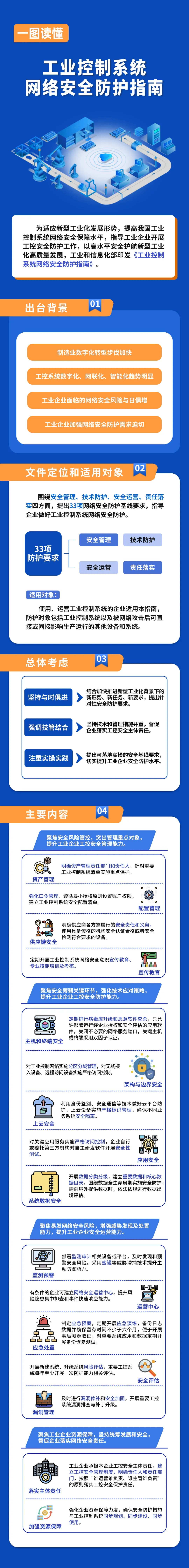 《防護指南》定位于面向工業企業做好網絡安全防護的指導性文件,堅持統籌發展和安全,圍繞安全管理、技術防護、安全運營、責任落實四方面,提出三十三項指導性安全防護基線要求,推動解決走好新型工業化道路過程中工業控制系統網絡安全面臨的突出問題。