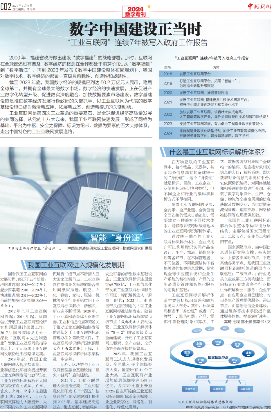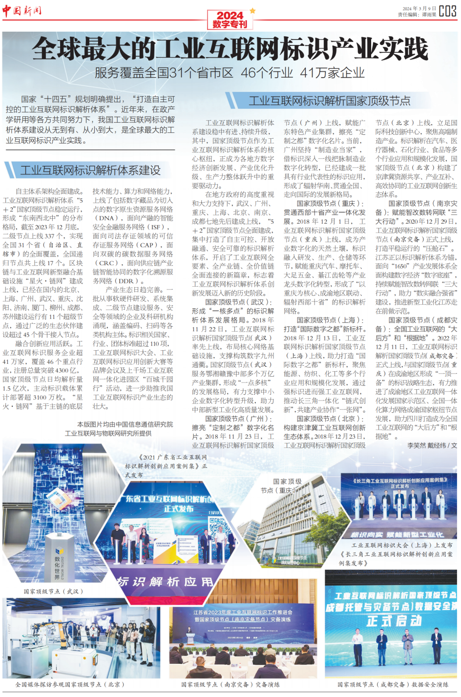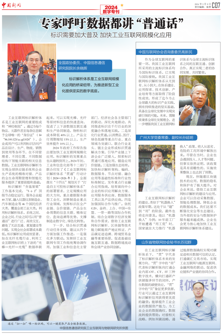3月9日,《中國新聞》報推出全國兩會數字???,從工業(yè)互聯網標識的蓬勃發(fā)展看“我們離數字中國還有多遠”。報道指出“如今,數字中國建設已經駛入快車道,以工業(yè)互聯網標識解析體系和“星火·鏈網”為代表的數字基礎設施,作為數字中國建設的重要內容,正在加速形成新質生產力,貫通千行百業(yè),賦能高質量發(fā)展?!睒俗R“貫通”勢在必行,規(guī)?;瘧玫陌l(fā)展離不開產業(yè)生態(tài)的共同努力。