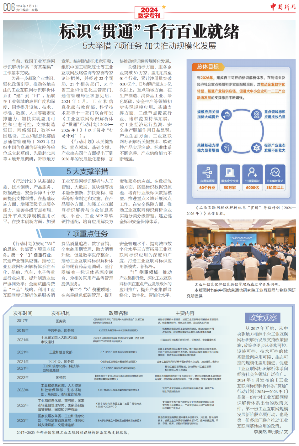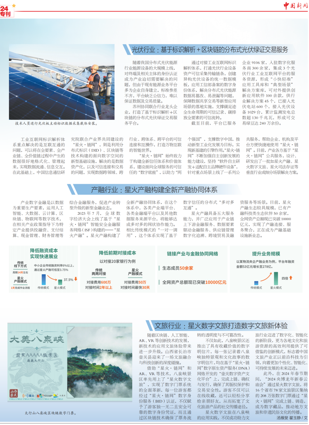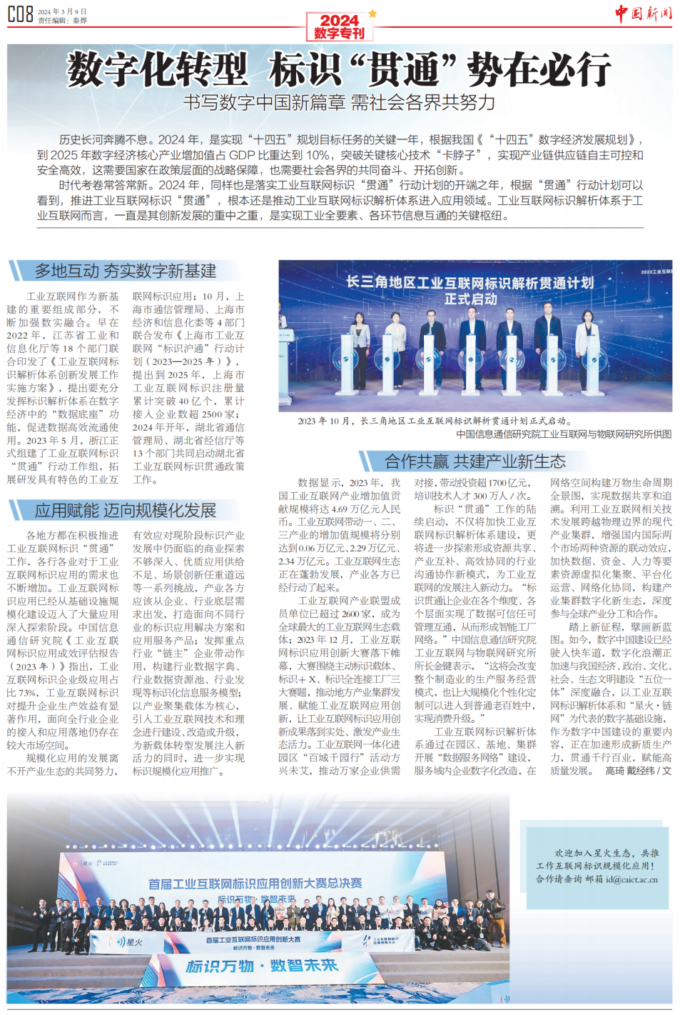 3月9日,《中國新聞》報推出全國兩會數字???,從工業(yè)互聯網標識的蓬勃發(fā)展看“我們離數字中國還有多遠”。報道指出“如今,數字中國建設已經駛入快車道,以工業(yè)互聯網標識解析體系和“星火·鏈網”為代表的數字基礎設施,作為數字中國建設的重要內容,正在加速形成新質生產力,貫通千行百業(yè),賦能高質量發(fā)展?!睒俗R“貫通”勢在必行,規(guī)?;瘧玫陌l(fā)展離不開產業(yè)生態(tài)的共同努力。