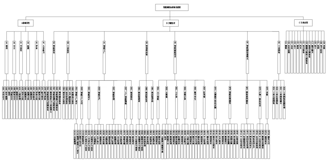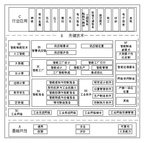 具體而言,A基礎(chǔ)共性標(biāo)準(zhǔn)包括通用、安全、可靠性、檢測(cè)、評(píng)價(jià)、人員能力等6大類,位于智能制造標(biāo)準(zhǔn)體系結(jié)構(gòu)圖的最底層,主要用于統(tǒng)一智能制造相關(guān)概念,解決智能制造基礎(chǔ)共性關(guān)鍵問(wèn)題,是B關(guān)鍵技術(shù)標(biāo)準(zhǔn)和C行業(yè)應(yīng)用標(biāo)準(zhǔn)的支撐。B關(guān)鍵技術(shù)標(biāo)準(zhǔn)是智能制造系統(tǒng)架構(gòu)智能特征維度在生命周期維度和系統(tǒng)層級(jí)維度所組成的制造平面的投影,主要解決企業(yè)智能制造推進(jìn)過(guò)程中需要解決的關(guān)鍵技術(shù)問(wèn)題,其中BA智能裝備標(biāo)準(zhǔn)主要聚焦智能特征維度的資源要素,BB工業(yè)軟件標(biāo)準(zhǔn)主要聚焦智能特征維度的系統(tǒng)集成,BC智能工廠標(biāo)準(zhǔn)主要聚焦智能特征維度的資源要素和系統(tǒng)集成,BD智慧供應(yīng)鏈標(biāo)準(zhǔn)對(duì)應(yīng)智能特征維度互聯(lián)互通、融合共享和系統(tǒng)集成,BE智能賦能技術(shù)標(biāo)準(zhǔn)對(duì)應(yīng)智能特征維度的資源要素、互聯(lián)互通、融合共享、系統(tǒng)集成和新興業(yè)態(tài),BF智能制造新模式標(biāo)準(zhǔn)對(duì)應(yīng)智能特征維度的新興業(yè)態(tài),BG工業(yè)網(wǎng)絡(luò)標(biāo)準(zhǔn)對(duì)應(yīng)智能特征維度的互聯(lián)互通和融合共享。C行業(yè)應(yīng)用標(biāo)準(zhǔn)位于智能制造標(biāo)準(zhǔn)體系結(jié)構(gòu)圖的最頂層,面向行業(yè)具體需求,對(duì)A基礎(chǔ)共性標(biāo)準(zhǔn)和B關(guān)鍵技術(shù)標(biāo)準(zhǔn)進(jìn)行細(xì)化和落地,指導(dǎo)各行業(yè)推進(jìn)智能制造。
