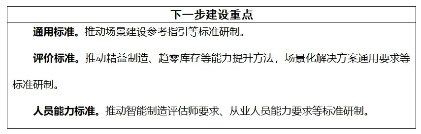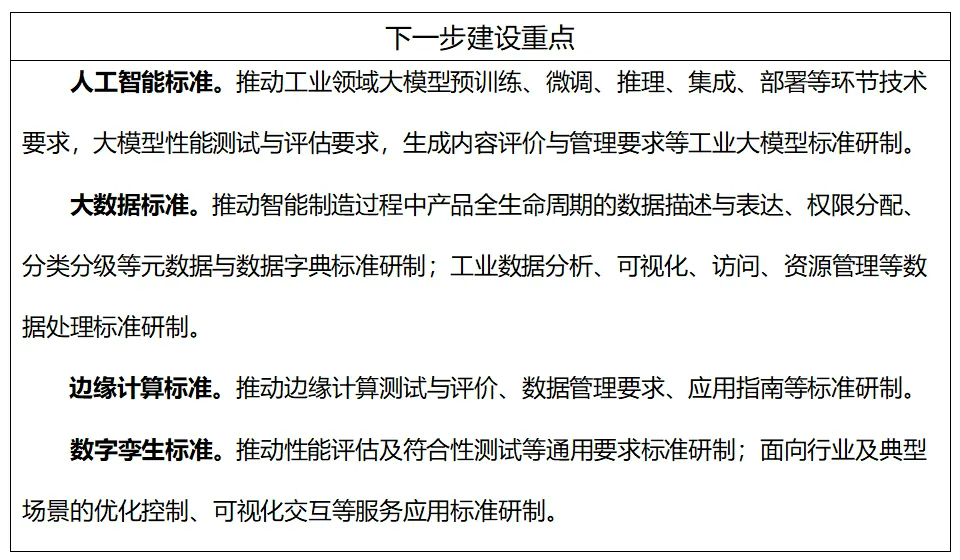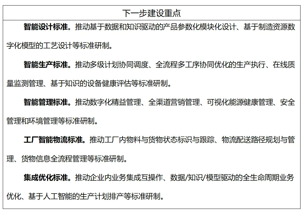 到2026年,制修訂100項(xiàng)以上國(guó)家標(biāo)準(zhǔn)、行業(yè)標(biāo)準(zhǔn),構(gòu)建適應(yīng)新型工業(yè)化發(fā)展的智能制造標(biāo)準(zhǔn)體系。加快制定智能檢測(cè)、智能物流等智能裝備標(biāo)準(zhǔn),研發(fā)設(shè)計(jì)、生產(chǎn)制造等工業(yè)軟件標(biāo)準(zhǔn),智能設(shè)計(jì)、智能管理等智能工廠標(biāo)準(zhǔn),供應(yīng)鏈建設(shè)、供應(yīng)鏈運(yùn)營(yíng)等智慧供應(yīng)鏈標(biāo)準(zhǔn),數(shù)字孿生裝備、人工智能工業(yè)應(yīng)用、工業(yè)數(shù)據(jù)流通等智能賦能技術(shù)標(biāo)準(zhǔn),網(wǎng)絡(luò)協(xié)同制造、產(chǎn)銷一體化運(yùn)營(yíng)等智能制造新模式標(biāo)準(zhǔn),工業(yè)無(wú)線網(wǎng)絡(luò)、工業(yè)網(wǎng)絡(luò)融合等工業(yè)網(wǎng)絡(luò)標(biāo)準(zhǔn),探索標(biāo)準(zhǔn)研制新方法,固化成功經(jīng)驗(yàn)和創(chuàng)新成果,形成典型場(chǎng)景系統(tǒng)解決方案標(biāo)準(zhǔn),引導(dǎo)企業(yè)應(yīng)用標(biāo)準(zhǔn)指導(dǎo)實(shí)踐,構(gòu)建企業(yè)智能制造標(biāo)準(zhǔn)體系,推動(dòng)智能制造高質(zhì)量發(fā)展。