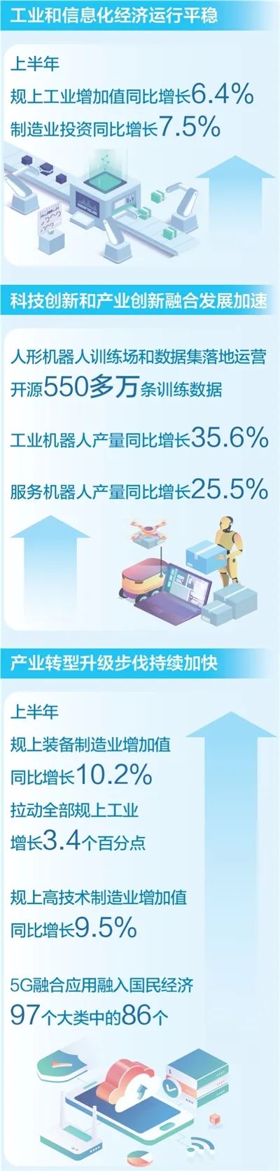 截至上半年,規(guī)上輕工業(yè)企業(yè)數(shù)字化研發(fā)工具普及率達(dá)86.2%;5G融合應(yīng)用融入國民經(jīng)濟(jì)97個大類中的86個,建設(shè)超過1.85萬個“5G+工業(yè)互聯(lián)網(wǎng)”項目……工業(yè)和信息化部信息通信發(fā)展司司長謝存介紹,上半年,傳統(tǒng)產(chǎn)業(yè)轉(zhuǎn)型升級步伐扎實,加快實現(xiàn)高質(zhì)量發(fā)展。