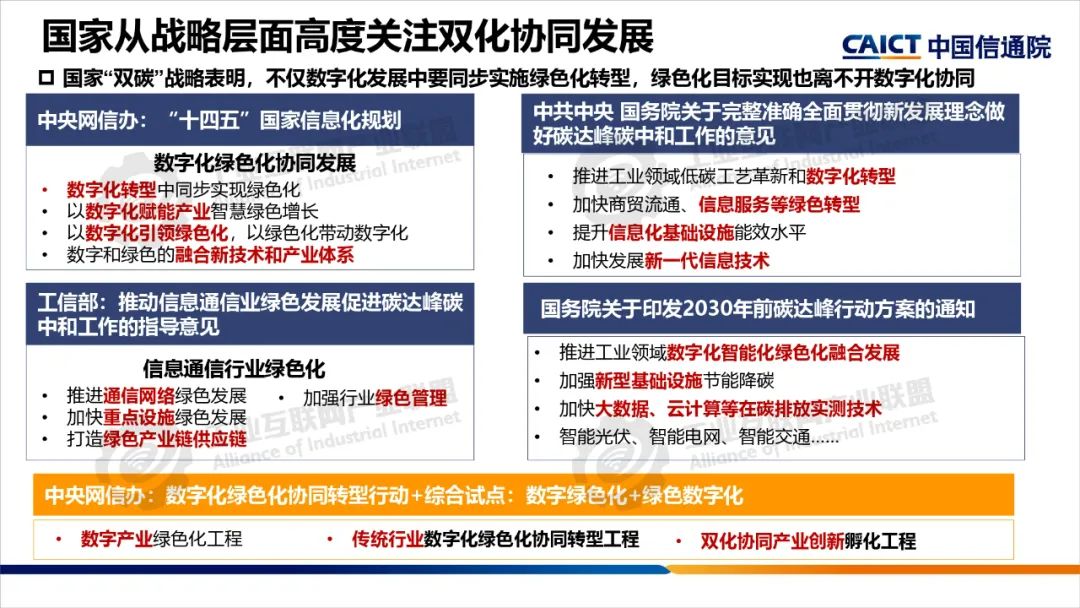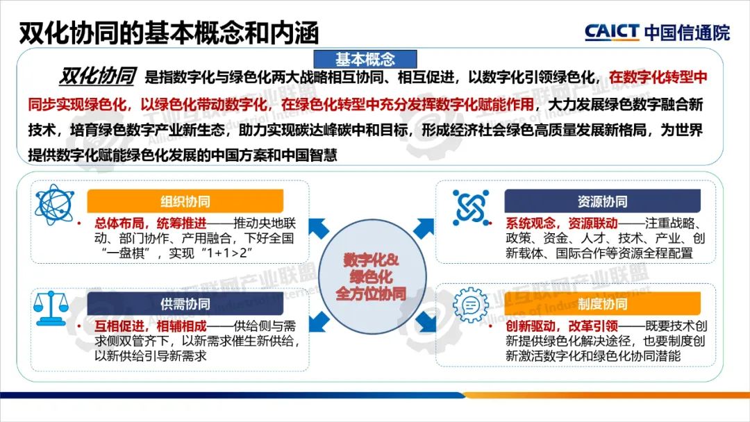 本期為您帶來由中國(guó)信息通信研究院產(chǎn)業(yè)與規(guī)劃研究所高級(jí)工程師王婧媛分享的《數(shù)字化綠色化協(xié)同轉(zhuǎn)型綜合試點(diǎn)建設(shè)解讀》。數(shù)字化轉(zhuǎn)型和綠色化轉(zhuǎn)型不僅是當(dāng)今世界發(fā)展的兩大主題,也是相互依存、相互促進(jìn)的孿生體。“雙化協(xié)同”是指數(shù)字化與綠色化兩大戰(zhàn)略相互協(xié)同、相互促進(jìn),在數(shù)字化轉(zhuǎn)型中同步實(shí)現(xiàn)綠色化,以綠色化帶動(dòng)數(shù)字化,在綠色化轉(zhuǎn)型中充分發(fā)揮數(shù)字化賦能作用,大力發(fā)展綠色數(shù)字融合新技術(shù),培育綠色數(shù)字產(chǎn)業(yè)新生態(tài)。