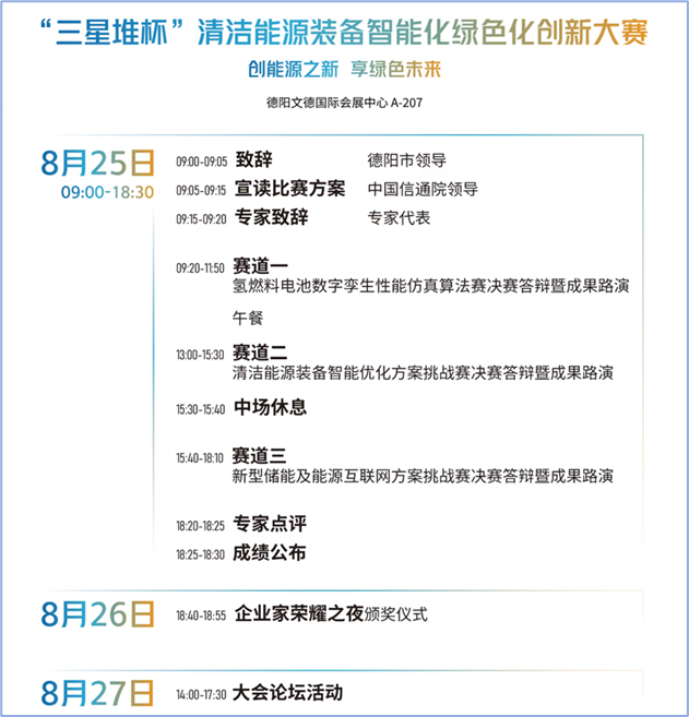 由世界清潔能源裝備大會組委會主辦,中國信息通信研究院聯(lián)合工業(yè)互聯(lián)網(wǎng)產(chǎn)業(yè)聯(lián)盟等單位共同舉辦的數(shù)境“三星堆杯”清潔能源裝備智能化綠色化創(chuàng)新大賽決賽暨成果路演即將于8月25日在四川德陽舉行。決賽選手們將通過演講、技術(shù)展示、產(chǎn)品展示等形式,向評委和觀眾展現(xiàn)解題思路和解決方案,接受專家評委質(zhì)詢,決出大賽獲獎排名并舉行頒獎儀式。