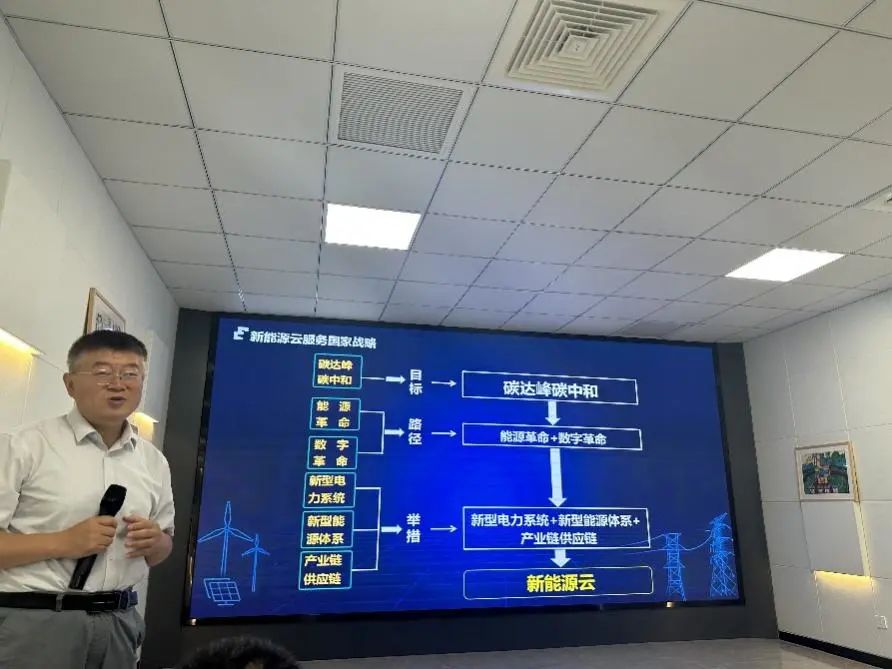 雙碳組湖州行第一站是參觀國網新能源云碳中和創新中心。國家電網新能源云首席專家、技術總監張崇見以“新能源云服務綠色發展和碳達峰碳中和實踐交流”為題,向調研代表們詳細介紹了國網新能源云的戰略定位、平臺功能、實踐應用和發展前景。國網新能源云作為聚合全數據要素的新型能源數字經濟平臺,將新一代信息技術與新能源、碳達峰碳中和、新型電力系統、新型能源體系的全價值鏈、全產業鏈、全生態圈進行深度融合,打造了建站選址、全電源線上接網、全過程補貼申報審核、全域消納能力計算和發布、運行監測和信息資訊、能源監管、碳中和支撐、綠色金融等八大功能服務。通過連接融合源網荷儲的數字信息,為數字電網平臺賦能,面向電動汽車、清潔供暖、屋頂光伏、儲能及智能家居等場景不斷培育新技術、新模式、新業態。