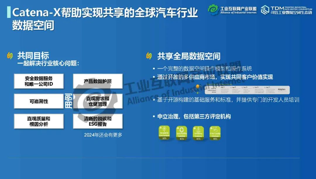 本期為您帶來由德國弗勞恩霍夫協會中國代表處代表楊雯帶來的《國際視野:Catena-X數據空間在汽車領域落地》。介紹了歐洲對數據空間的需求和定義,數據空間標準化、生態發展情況,以及德國弗勞恩霍夫協會與中國信息通信研究院在數據空間領域開展的深入合作。Catena-X旨在形成汽車行業主權可控多層次數據生態,為汽車價值鏈創建數據生態系統,構建全球汽車行業全價值鏈數據生態合作的宏大愿景。