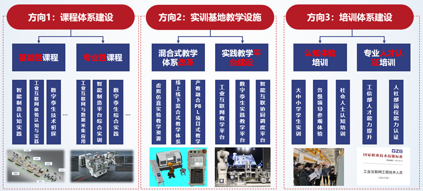 實(shí)訓(xùn)基地從產(chǎn)業(yè)人才培養(yǎng)需求出發(fā),深挖工業(yè)互聯(lián)網(wǎng)行業(yè)應(yīng)用型人才培養(yǎng)的新時(shí)期內(nèi)核,積極開(kāi)展課程體系教育教學(xué)改革。目前主要面向三個(gè)方向開(kāi)設(shè)相應(yīng)實(shí)訓(xùn)課程:工業(yè)互聯(lián)網(wǎng)方向,智能制造方向和數(shù)字孿生方向。其中,工業(yè)互聯(lián)網(wǎng)方向主要內(nèi)容包括工業(yè)互聯(lián)網(wǎng)基礎(chǔ)知識(shí)、產(chǎn)品模式及層級(jí)劃分、工業(yè)互聯(lián)網(wǎng)基礎(chǔ)技術(shù)及應(yīng)用技術(shù)和行業(yè)解決案例等;智能制造方向主要內(nèi)容包括工業(yè)4.0與智能制造發(fā)展趨勢(shì)、電氣原理、PLC控制、生產(chǎn)計(jì)劃控制、智能傳感互聯(lián)、工業(yè)機(jī)器人與自動(dòng)化等;數(shù)字孿生方向主要內(nèi)容包括數(shù)字孿生起源、定義、技術(shù)體系、模型構(gòu)建與一體化設(shè)計(jì)、接口、通信、虛實(shí)連接、應(yīng)用實(shí)踐等。