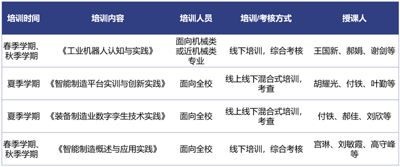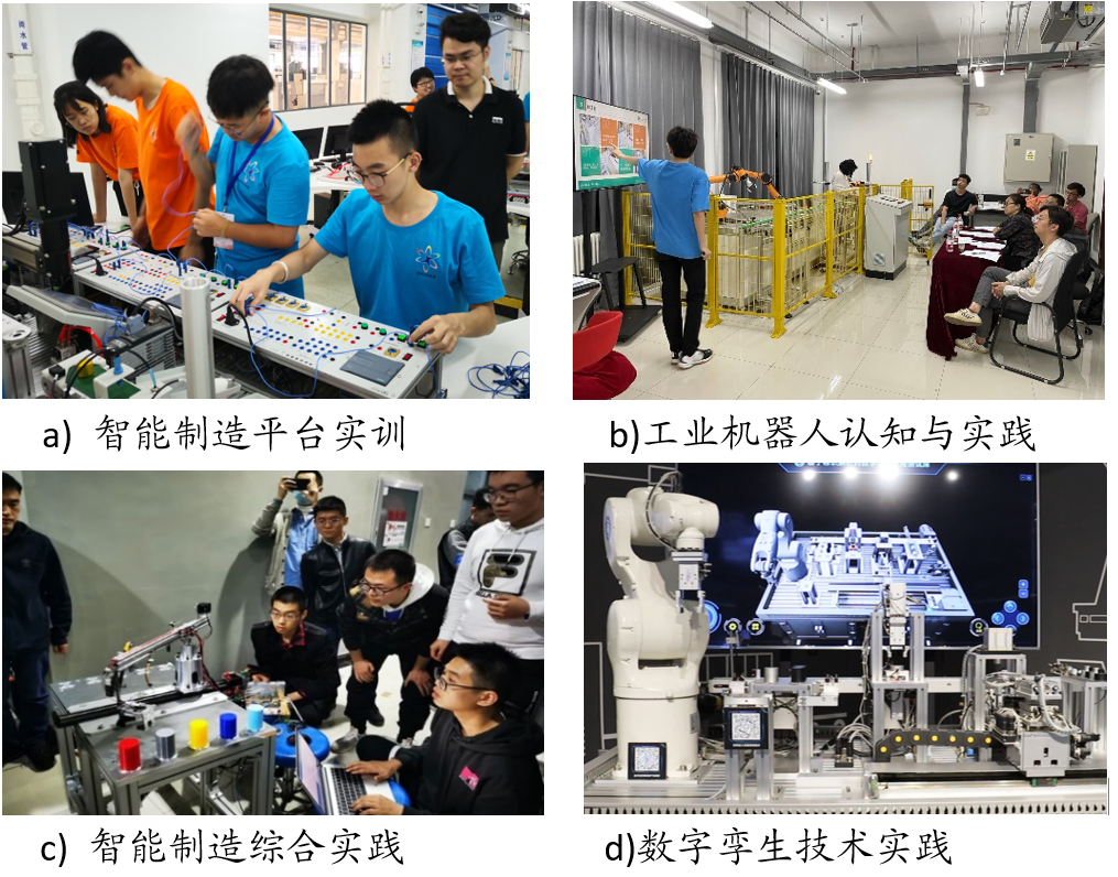 現(xiàn)有課程包括《工程訓(xùn)練》、《制造技術(shù)基礎(chǔ)訓(xùn)練》、《智能制造綜合實(shí)踐》、《工業(yè)機(jī)器人認(rèn)知與實(shí)踐》、《數(shù)字孿生技術(shù)實(shí)踐》、《智能制造平臺(tái)實(shí)訓(xùn)》以及《生產(chǎn)系統(tǒng)綜合設(shè)計(jì)與實(shí)驗(yàn)》等,從多個(gè)方向面向工業(yè)互聯(lián)網(wǎng)相關(guān)人才提供實(shí)踐能力、職業(yè)素養(yǎng)、創(chuàng)新精神等方面的綜合培養(yǎng),為培養(yǎng)適應(yīng)工業(yè)互聯(lián)網(wǎng)發(fā)展需要的高素質(zhì)、全面發(fā)展的產(chǎn)業(yè)人才提供良好實(shí)訓(xùn)條件。考試考核方法目前主要采用考查方式,以實(shí)踐任務(wù)完成情況為打分依據(jù),對(duì)學(xué)員進(jìn)行考核。