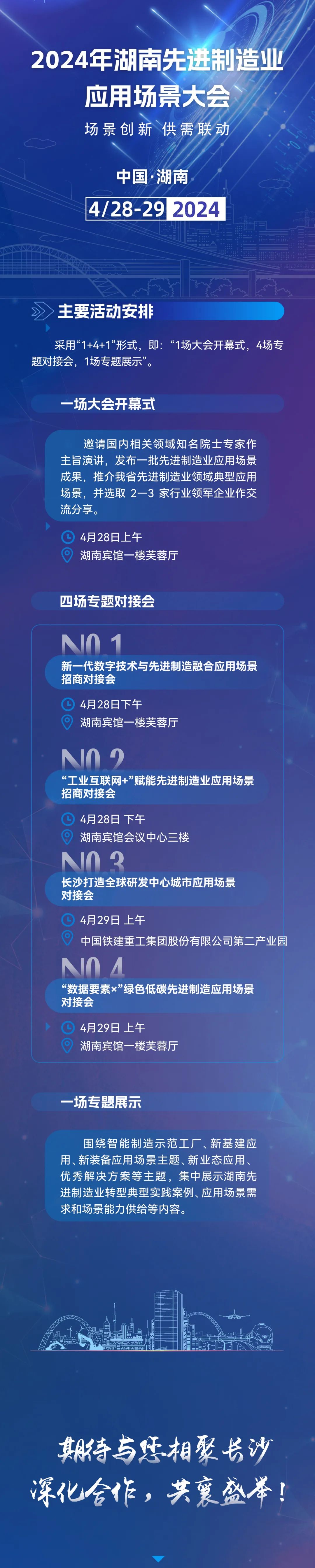 4月28日-29日,由湖南省商務廳、省發展改革委、省科技廳、省工業和信息化廳、省國資委、省數據局、長沙市人民政府共同主辦的2024年湖南先進制造業應用場景大會將于湖南長沙舉行。