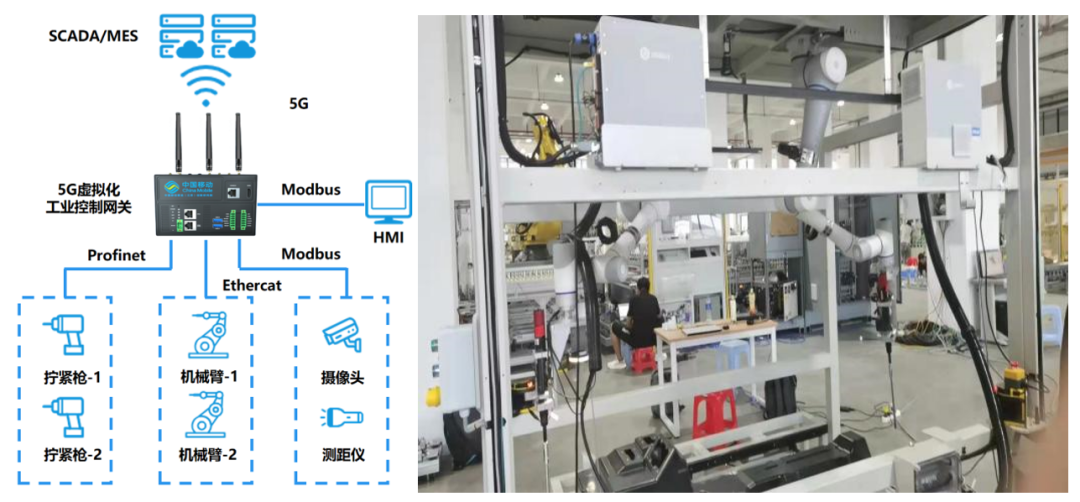 中國移動與國內某新能源廠商合作,在電池組裝產線完成5G+虛擬化PLC技術驗證應用。核心方案是采用一臺安裝虛擬化PLC的5G工業控制網關,實現對“傳統PLC+數采網關”的二合一替換。5G工業控制網關首先通過掃描槍、測距儀完成位置標定,控制機械臂移動到電池模組位置。隨后控制機械臂上的擰緊槍完成電池模組的安裝擰緊。在此案例中,5G工業控制網關不僅提供PLC實時控制服務,也提供5G數據采集、遠程運維服務。從而將傳統的“現場I/O-PLC-數采網關”三層架構壓縮成“現場I/O-5G工業控制網關”扁平架構,解決了傳統方案控制層級多、專用設備多,成本居高不下,難以實現無人化/少人化運維等痛點問題,設備硬件成本和運維成本均下降50%。