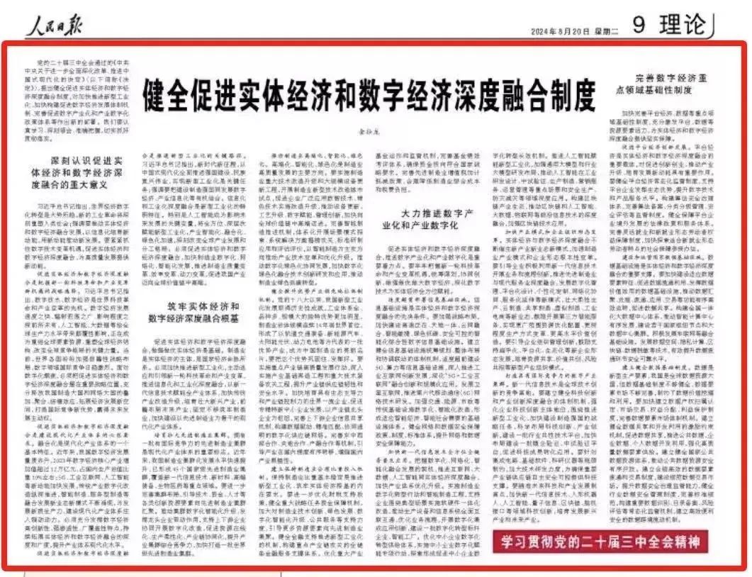 《〈中共中央關于進一步全面深化改革、推進中國式現代化的決定〉輔導讀本》收錄了工業和信息化部黨組書記、部長金壯龍的署名文章《健全促進實體經濟和數字經濟深度融合制度》。8月20日,《人民日報》理論版刊發此文,“工信微報”為您全文分享如下——