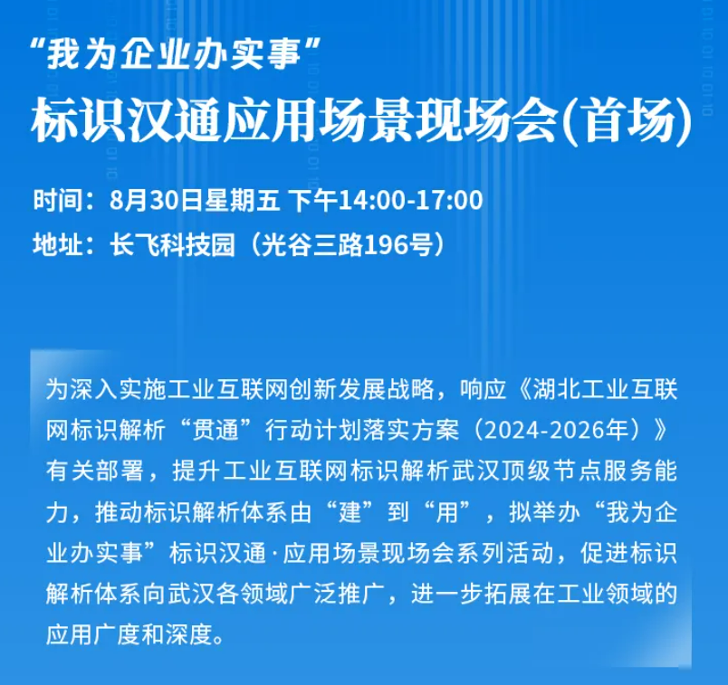 為深入實施工業互聯網創新發展戰略,響應《湖北工業互聯網標識解析“貫通”行動計劃落實方案(2024-2026年)》有關部署,提升工業互聯網標識解析武漢頂級節點服務能力,推動標識解析體系由“建”到“用”,武漢市經濟和信息化局、工業互聯網產業聯盟聯合舉辦“我為企業辦實事”標識漢通·應用場景現場會系列活動,旨在促進標識解析體系向武漢各領域廣泛推廣,進一步拓展在工業領域的應用廣度和深度。