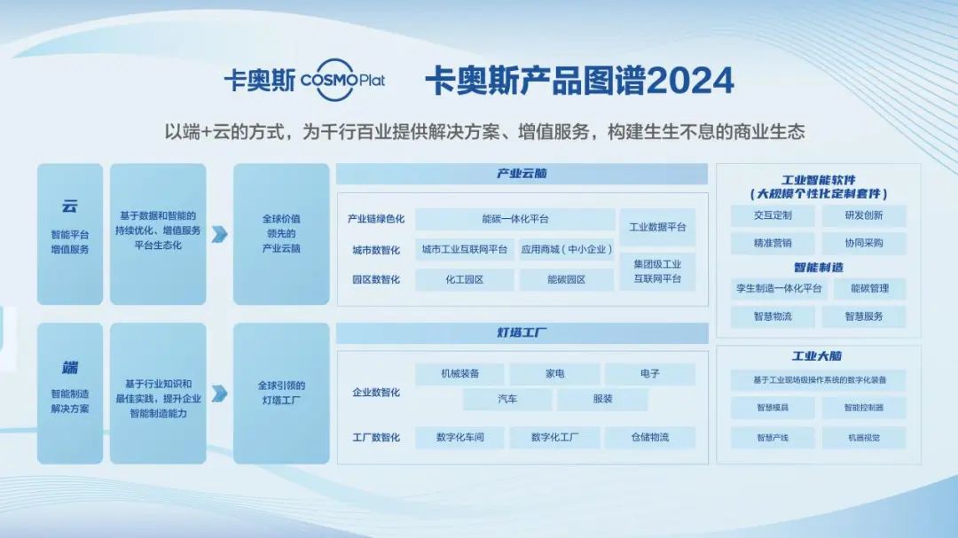 此次卡奧斯COSMOPlat還現場展示其構建的ONE-COSMO產品圖譜,提供基于場景生態的數字化轉型解決方案,形成“燈塔工廠”和“產業云腦”兩大高端系列產品,提供工廠數智化、企業數智化、園區數智化、城市數智化、產業鏈綠色化的解決方案和增值服務。