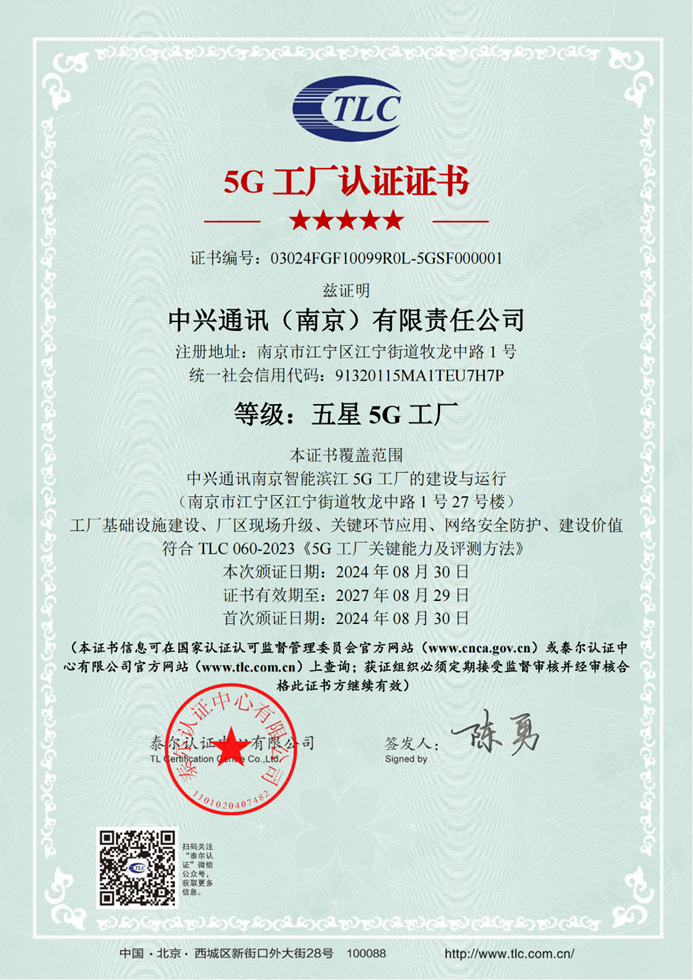值此工業(yè)和信息化部《5G全連接工廠建設(shè)指南》發(fā)布兩周年,國內(nèi)首個五星5G工廠——中興通訊南京智能濱江5G工廠(以下簡稱“濱江工廠”)建設(shè)完成,通過中國信息通信研究院(簡稱“中國信通院”)泰爾認證中心認證,成為5G技術(shù)與電子設(shè)備制造業(yè)深度融合與全面應(yīng)用的新標桿。