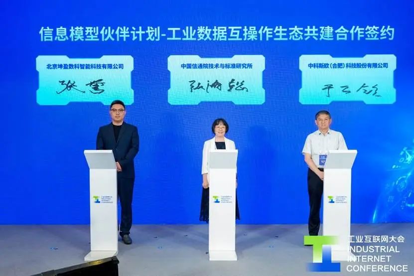 在信息模型伙伴計(jì)劃-工業(yè)數(shù)據(jù)互操作生態(tài)共建合作簽約儀式環(huán)節(jié),中國(guó)信通院技術(shù)與標(biāo)準(zhǔn)研究所所長(zhǎng)張海懿、中科斯歐(合肥)科技股份有限公司董事長(zhǎng)于萬(wàn)欽、北京坤盈數(shù)科智能科技有限公司總經(jīng)理張譽(yù)共同簽約。后續(xù),三方將在工業(yè)數(shù)據(jù)互操作領(lǐng)域深化合作,共同開(kāi)展技術(shù)研究、標(biāo)準(zhǔn)編制、案例打造等工作,攜手推動(dòng)信息模型發(fā)展。
