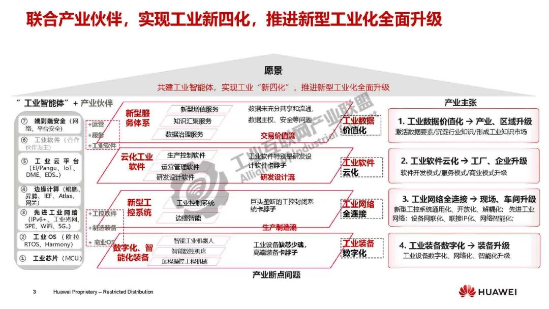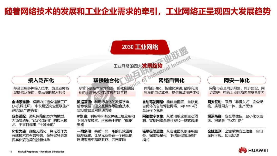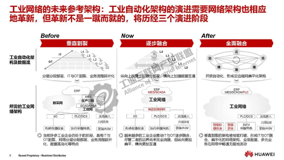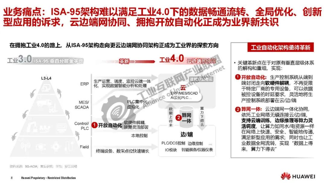 關鍵革新點在于對原有垂直層級體系的解構和重組,實現: ①開放自動化:生產控制系統從端到端耦合封閉走向分層解耦、開放通用,不再受限于特定廠商的專用設備,可靈活地將生產控制系統部署在云/邊/端。②算網一體:云邊端網一體化協同,依托工業網絡無縫連接云/邊/端, 支持云端訓練,邊緣推理等算力靈活調度,讓算力如同水/電資源一樣在網絡上快速、安全、智能地傳遞,滿足新型應用的需求;同時也讓工業數據全網流轉,實現“數據上得來,算力下得去”。