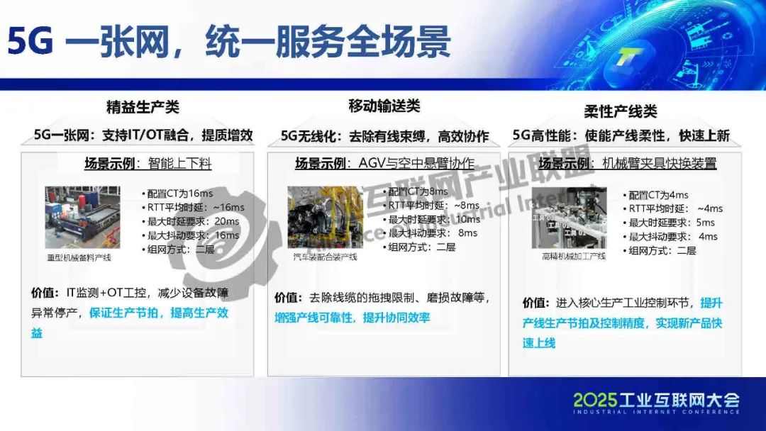 5G一張網打通IT與OT,突破接口協議兼容、網絡確定性等核心技術,實現“數據上得來、管理下得去”,支持柔性化、智能化生產。