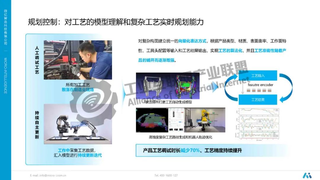 唐淼鑫介紹,工業場景要求絕對定位精度和高效執行,充分利用2D特征將空間對象的6D感知精度由3~5mm提高到亞毫米級。對復雜構面建立統一的向量化表達方式,根據產品類型、材質、表面曲率、工作面特性、工具頭配置等輸入和工藝結果輸出,實現工藝的算法化,并且工藝準確性隨著產品的鋪開而逐漸增強。