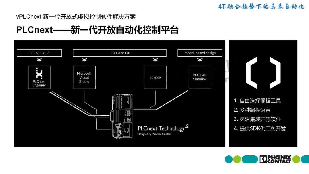 梁恩泉介紹,菲尼克斯電氣推出基于PLCnext技術的SoftPLC解決方案,突破傳統PLC硬件限制,實現虛擬化部署。該方案將PLC運行時環境(SoftPLC Runtime/eCLR)嵌入用戶硬件平臺,支持IEC 61131-3與C/C++等高級語言混合編程,并兼容工業機器人、數控機床等多場景需求。最新發布的PLCnext Virtual Control作為純軟件方案,可在通用硬件上動態創建PLC實例,實現功能靈活擴展和集中維護。該技術通過IT/OT深度融合,集成開源生態,為基礎設施、能源、工廠自動化等領域提供數字化底座,推動工業自動化進入"硬件平臺化、軟件服務化"的新階段。