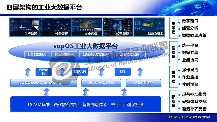 基于supOS的四層架構工業(yè)大數據平臺,旨在實現企業(yè)全鏈路數據整合與智能化管理。平臺通過設備數據、視頻數據和業(yè)務系統數據的多源接入,構建企業(yè)級數據倉庫,并依托協議驅動、API適配和ETL工具實現高效數據流轉。
