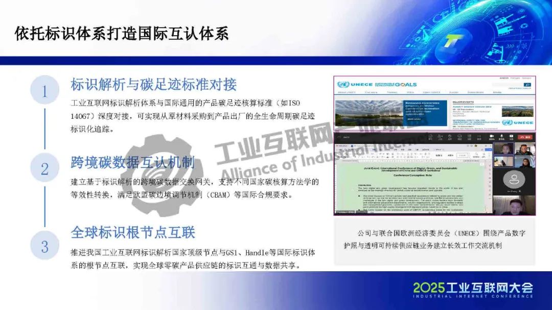 在國際互認方面,依托標識體系,可以構建中國零碳園區國際認證的高效互認體系,增強我國在綠色貿易中的話語權。基于標識解析的跨境碳數據交換網關,能夠支持不同國家碳核算方法學的等效轉換,滿足歐盟碳邊境調節機制(CBAM)等國際合規要求,實現跨境碳數據的互認。此外,工業互聯網標識解析體系還與國際通用的產品碳足跡核算標準ISO14067深度對接,可實現產品從原材料采購到出廠全生命周期碳足跡的標識化追蹤。