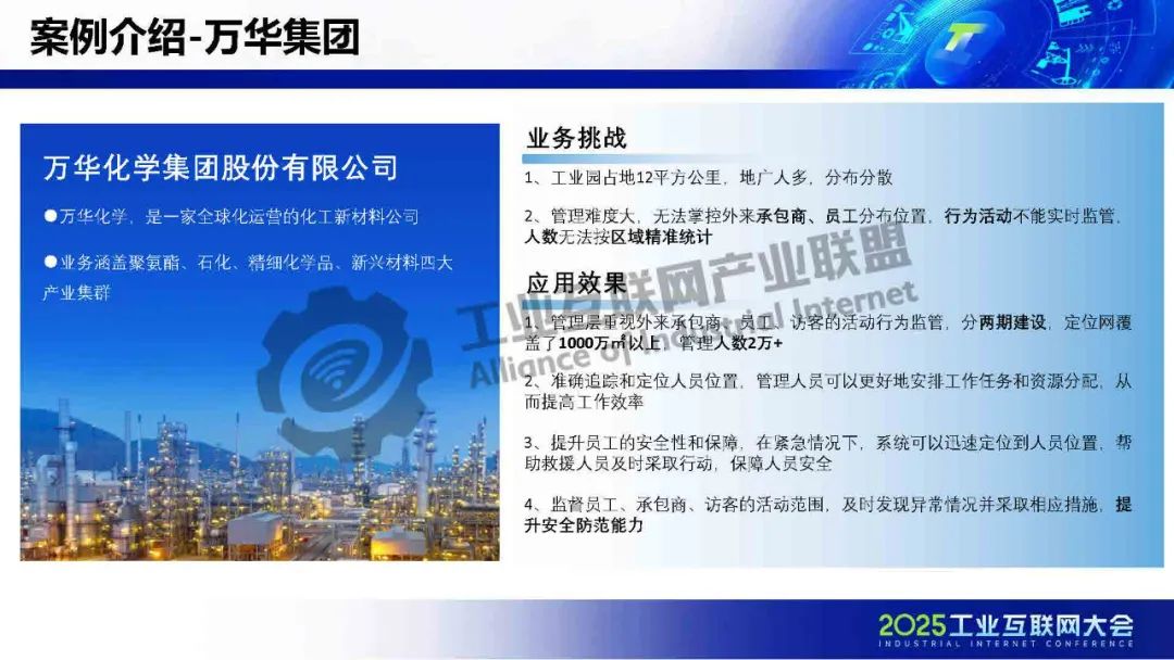 謝飛鵬分享了數字化轉型下危化企業安全生產管理的新模式。真趣科技作為國家高新技術企業,依托位置物聯網和預測性維護技術,幫助企業管控人員不安全行為和設備異常狀態。分析顯示,96%的安全事故源于人的不安全行為和物的不安全狀態,而傳統管理存在數據孤島、系統冗余等痛點。為此,真趣提出“一網一圖一平臺”數字底座,通過智能人員定位和AI驅動的設備預測性維護,實現精細化安全管理。該方案已在中化、萬華等企業成功落地,覆蓋千萬㎡廠區,降低設備故障率30%,減少非計劃停機,顯著提升安全與運營效率,驗證了數字化轉型在危化行業的實踐價值。