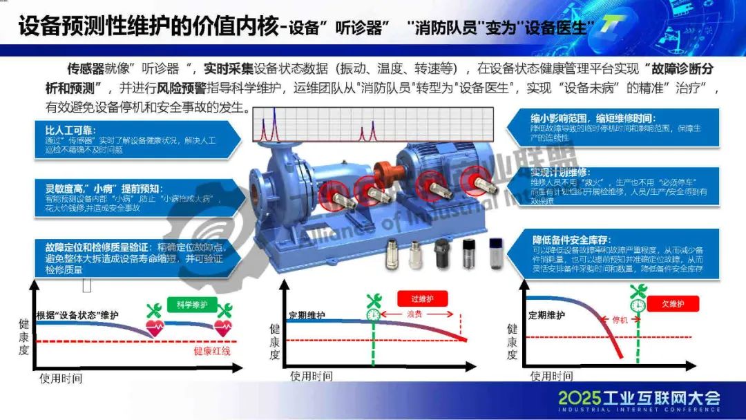 傳感器就像”聽診器“,實時采集設備狀態數據,在設備狀態健康管理平臺實現“故障診斷分析和預測”,并進行風險預警指導科學維護,運維團隊從"消防隊員"轉型為"設備醫生",實現“設備未病”的精準”治療”,有效避免設備停機和安全事故的發生。