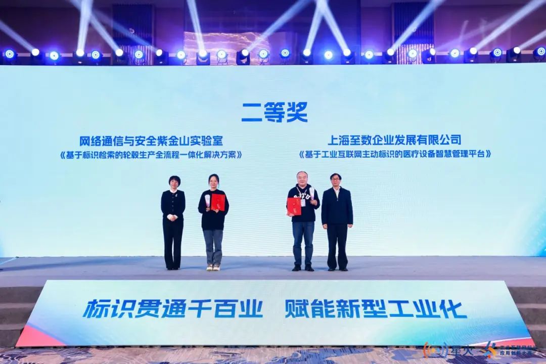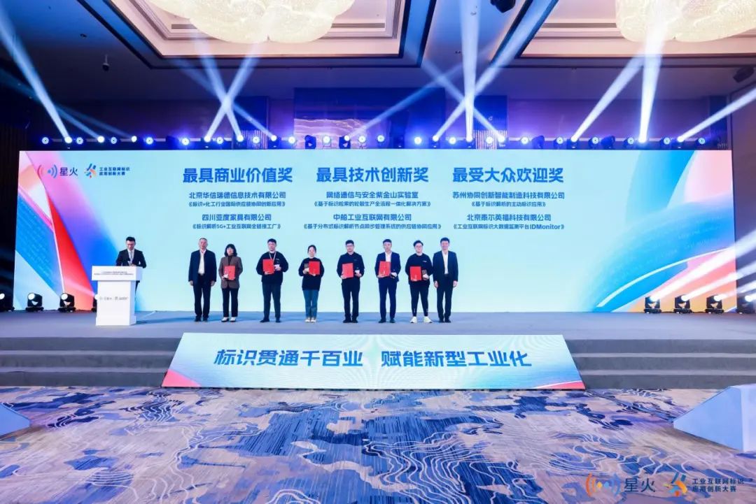 北京華信瑞德信息技術有限公司的《標識+化工行業國際供應鏈協同創新應用》,四川亞度家具有限公司的《標識解析5G+工業互聯網全鏈接工廠》獲最具商業價值獎;網絡通信與安全紫金山實驗室的《基于標識檢索的輪轂生產全流程一體化解決方案》,中船工業互聯網有限公司的《基于分布式標識解析節點同步管理系統的供應鏈協同應用》獲最具技術創新獎;蘇州協同創新智能制造科技有限公司的《基于標識解析的主動標識應用》,北京泰爾英福科技有限公司的《工業互聯網標識大數據監測平臺IDMonitor》獲最受大眾歡迎獎。