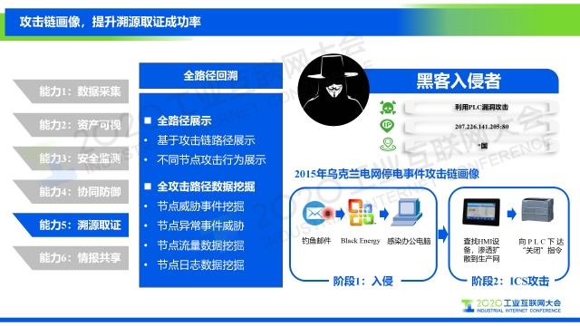 “基于我們對工業互聯網安全框架的解讀,從攻擊者視角、防御者視角和管理者視角三個維度出發,我們提出從資產監測、安全感知、風險管理三個方面實現工業互聯網安全的可視化,以及需要具備的六大關鍵能力,分別是數據采集、資產可視、安全監測、協同防御、溯源取證、情報共享。”