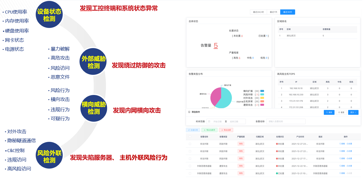 支持安全合規檢測、異常攻擊檢測、非法外聯檢測、設備運行狀態檢測、內網異常訪問檢測、非法程序啟動檢測、APT攻擊檢測、惡意加密流量檢測等。