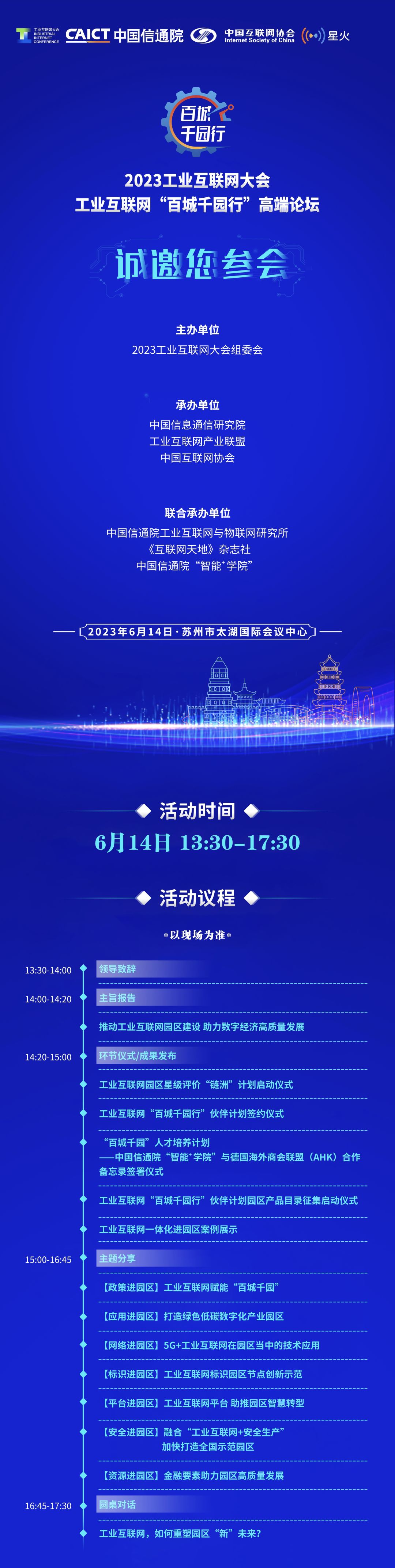 為貫徹黨的二十大精神,加快落實“十四五”規(guī)劃綱要關(guān)于“穩(wěn)妥發(fā)展工業(yè)互聯(lián)網(wǎng)”的相關(guān)要求,深入實施《工業(yè)互聯(lián)網(wǎng)創(chuàng)新發(fā)展行動計劃(2021-2023年)》,大力推進(jìn)工業(yè)互聯(lián)網(wǎng)規(guī)模化應(yīng)用,促進(jìn)產(chǎn)業(yè)數(shù)字化轉(zhuǎn)型,為加速我國新型工業(yè)化發(fā)展提供關(guān)鍵支撐, 由工業(yè)和信息化部、江蘇省人民政府主辦,中國信息通信研究院、江蘇省工業(yè)和信息化廳、江蘇省通信管理局、蘇州市人民政府、工業(yè)互聯(lián)網(wǎng)產(chǎn)業(yè)聯(lián)盟、中國通信學(xué)會、中國互聯(lián)網(wǎng)協(xié)會聯(lián)合承辦的【2023工業(yè)互聯(lián)網(wǎng)大會】,將于2023年6月14-16日在江蘇省蘇州市舉辦,本次大會由開幕式、高峰對話、高端論壇、學(xué)術(shù)大會、成果報告會、成果展示、現(xiàn)場調(diào)研、企業(yè)路演等40余場豐富的產(chǎn)業(yè)活動組成。