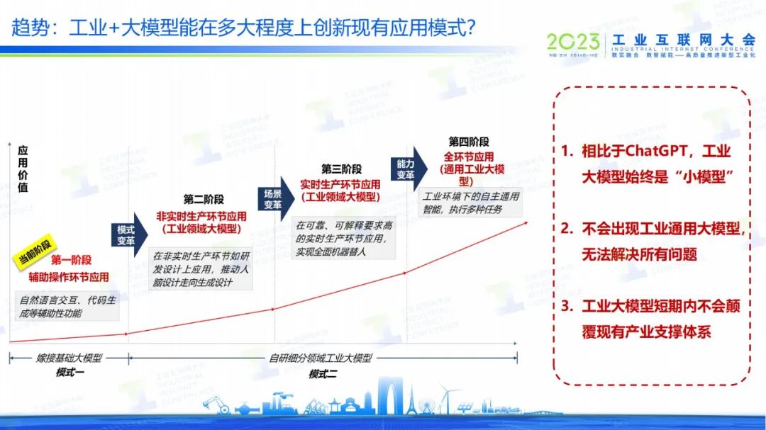 “當(dāng)前工業(yè)大模型未來應(yīng)用發(fā)展分為兩大模式、四個(gè)階段,但也面臨數(shù)據(jù)、產(chǎn)業(yè)等方面挑戰(zhàn)。他認(rèn)為:工業(yè)大模型是在現(xiàn)有工業(yè)智能可解問題的范疇之內(nèi)提升效率或解決一些更深層次的問題,在短期內(nèi)應(yīng)該不會(huì)顛覆現(xiàn)有的產(chǎn)業(yè)支撐體系,更多的還是以被疊加的特點(diǎn)融入現(xiàn)有的工業(yè)產(chǎn)品。”