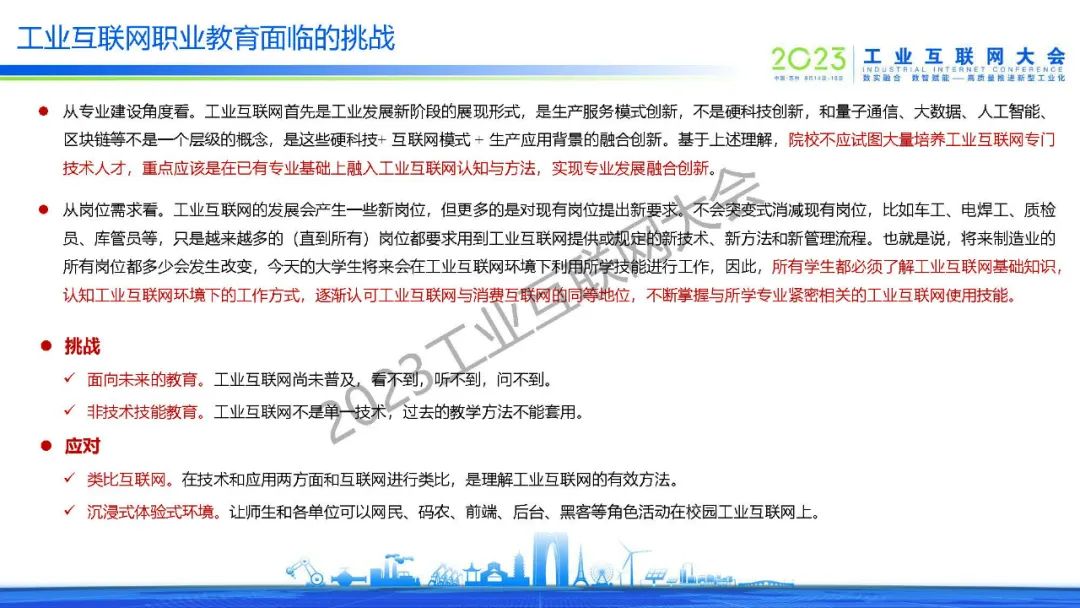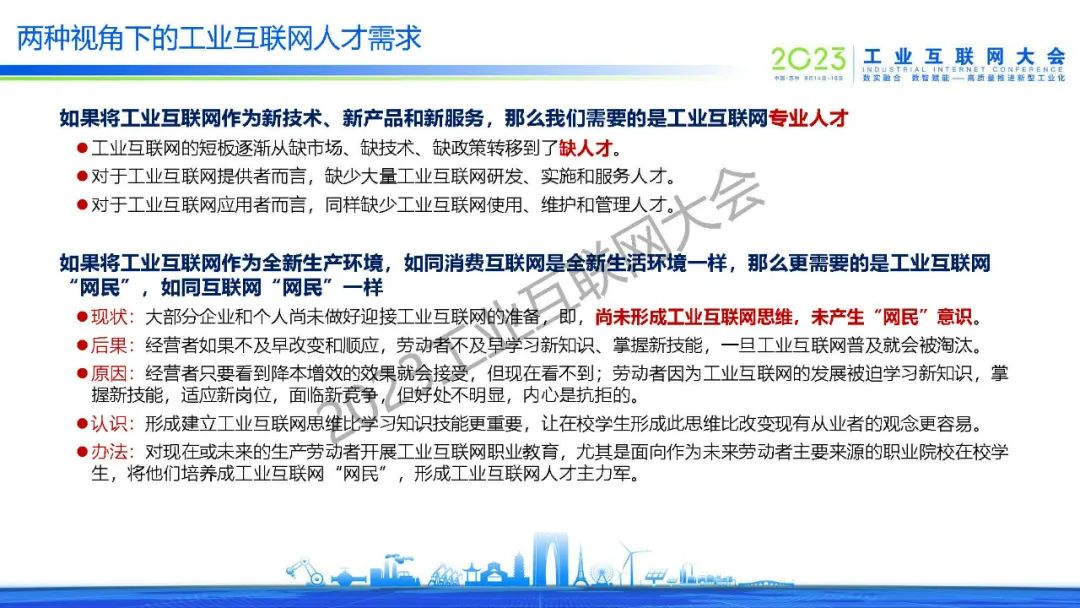 魏磊表示工業(yè)互聯(lián)網(wǎng)首先是工業(yè)發(fā)展新階段的展現(xiàn)形式,是生產(chǎn)服務(wù)模式創(chuàng)新,不是硬科技創(chuàng)新,和量子通信、大數(shù)據(jù)、人工智能、區(qū)塊鏈等不是一個(gè)層級(jí)的概念,是這些硬科技+ 互聯(lián)網(wǎng)模式 + 生產(chǎn)應(yīng)用背景的融合創(chuàng)新。基于上述理解,院校不應(yīng)試圖大量培養(yǎng)工業(yè)互聯(lián)網(wǎng)專門(mén)技術(shù)人才,重點(diǎn)應(yīng)該是在已有專業(yè)基礎(chǔ)上融入工業(yè)互聯(lián)網(wǎng)認(rèn)知與方法,實(shí)現(xiàn)專業(yè)發(fā)展融合創(chuàng)新。同時(shí),所有學(xué)生都必須了解工業(yè)互聯(lián)網(wǎng)基礎(chǔ)知識(shí),認(rèn)知工業(yè)互聯(lián)網(wǎng)環(huán)境下的工作方式,逐漸認(rèn)可工業(yè)互聯(lián)網(wǎng)與消費(fèi)互聯(lián)網(wǎng)的同等地位,不斷掌握與所學(xué)專業(yè)緊密相關(guān)的工業(yè)互聯(lián)網(wǎng)使用技能。