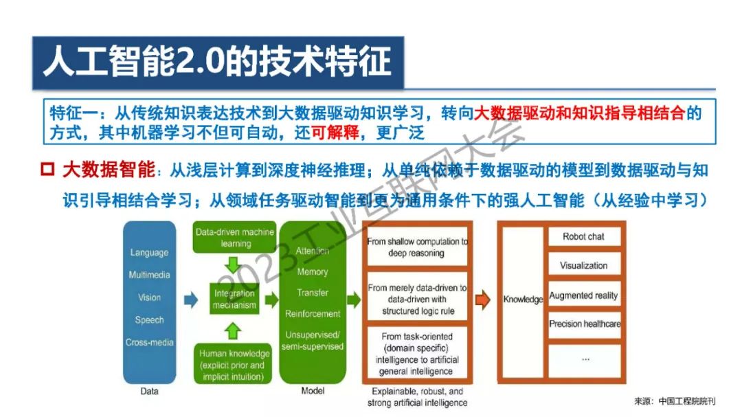 人工智能2.0的技術特征之一是從傳統知識表達技術到大數據驅動知識學習,轉向大數據驅動和知識指導相結合的方式,其中機器學習不但可自動,還可解釋,更廣泛。