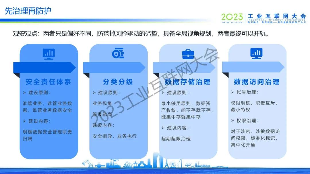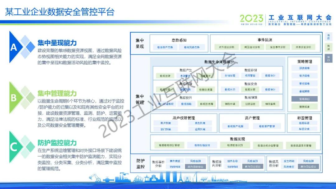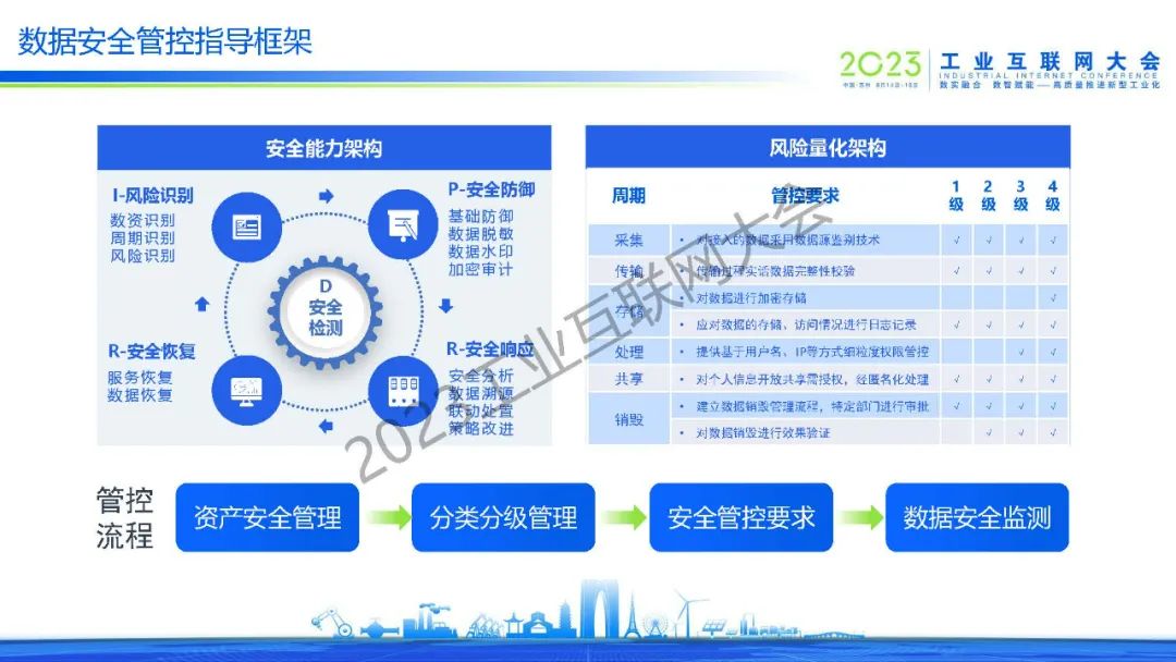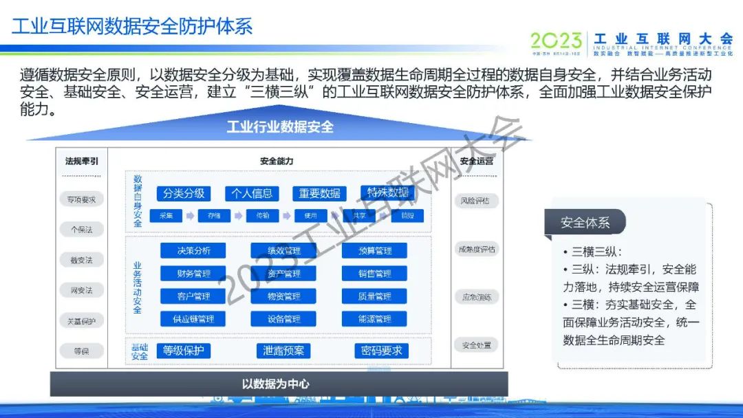 “遵循數據安全原則,以數據安全分級為基礎,實現覆蓋數據生命周期全過程的數據自身安全,并結合業務活動安全、基礎安全、安全運營,建立“三橫三縱”的工業互聯網數據安全防護體系,全面加強工業數據安全保護能力。”