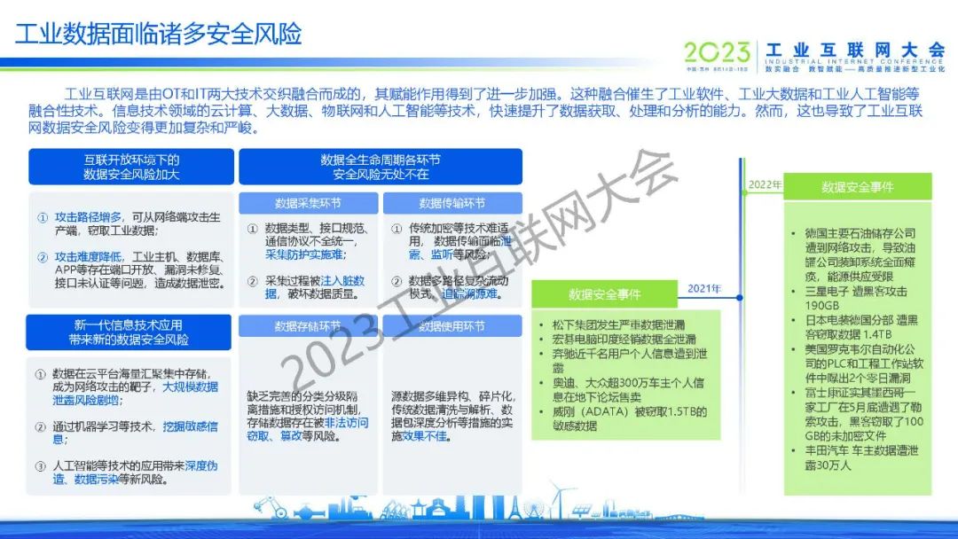 王亭景介紹,工業互聯網是由OT和IT兩大技術交織融合而成的,其賦能作用得到了進一步加強。這種融合催生了工業軟件、工業大數據和工業人工智能等融合性技術。信息技術領域的云計算、大數據、物聯網和人工智能等技術,快速提升了數據獲取、處理和分析的能力。然而,這也導致了工業互聯網數據安全風險變得更加復雜和嚴峻。