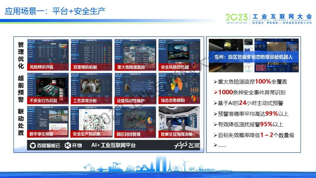吳學(xué)義指出,百度通過AI+工業(yè)互聯(lián)網(wǎng)助力園區(qū)高質(zhì)量發(fā)展,達(dá)到高產(chǎn)高效,綠色低碳,安全可控,營商便捷和活力創(chuàng)新等效果。同時,吳學(xué)義也分享了平臺+安全生產(chǎn)、平臺+綠色低碳、平臺+產(chǎn)業(yè)大腦、平臺+企業(yè)賦能等多個應(yīng)用場景。