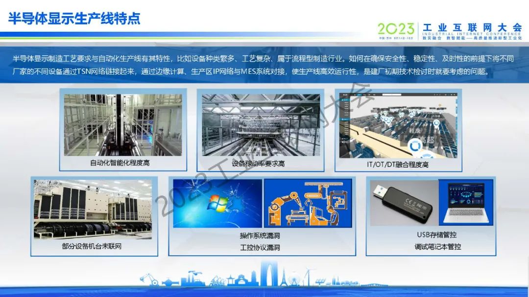 “半導(dǎo)體顯示制造工藝要求與自動(dòng)化生產(chǎn)線有其特性,比如設(shè)備種類(lèi)繁多、工藝復(fù)雜、屬于流程型制造行業(yè)。如何在確保安全性、穩(wěn)定性、及時(shí)性的前提下將不同廠家的不同設(shè)備通過(guò)TSN網(wǎng)絡(luò)鏈接起來(lái),通過(guò)邊緣計(jì)算、生產(chǎn)區(qū)IP網(wǎng)絡(luò)與MES系統(tǒng)對(duì)接,使生產(chǎn)線高效運(yùn)行性,是建廠初期技術(shù)檢討時(shí)就要考慮的問(wèn)題。