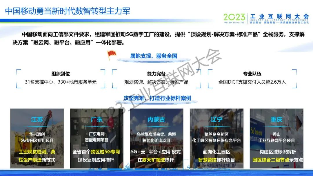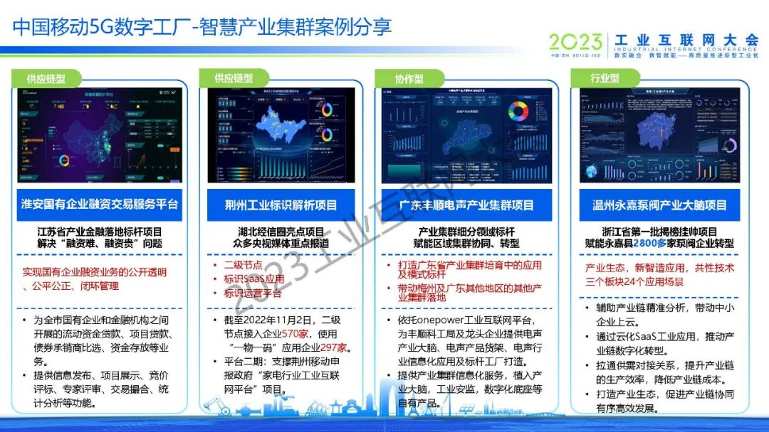 陳豫蓉表示,中國(guó)移動(dòng)組建軍團(tuán)推動(dòng)5G數(shù)字工廠的建設(shè),提供“頂設(shè)規(guī)劃-解決方案-標(biāo)準(zhǔn)產(chǎn)品”全棧服務(wù),支撐解決方案“融云網(wǎng)、融平臺(tái)、融應(yīng)用”一體化部署。她介紹到,產(chǎn)業(yè)集群數(shù)字化轉(zhuǎn)型是以工業(yè)互聯(lián)網(wǎng)為支撐,運(yùn)用新一代信息技術(shù),通過(guò)產(chǎn)業(yè)大腦、產(chǎn)業(yè)金融、產(chǎn)業(yè)監(jiān)測(cè)分析、標(biāo)識(shí)服務(wù)及企業(yè)數(shù)字化應(yīng)用等服務(wù)實(shí)現(xiàn)。集群類(lèi)型不同,數(shù)字化目的不同,導(dǎo)致推廣數(shù)字化建設(shè)的方式與主體也有所區(qū)別。