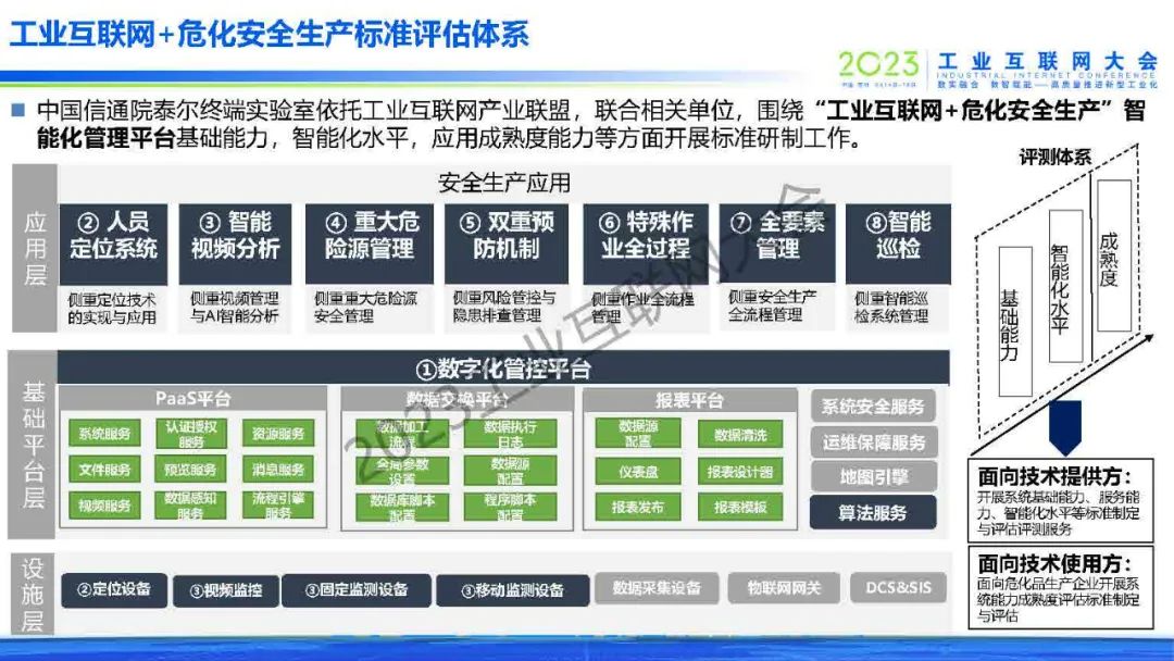 6月15日,在2023工業互聯網大會“工業互聯網+危化安全生產數字化轉型論壇”上,中國信息通信研究院泰爾終端實驗室戰略部業務主管/高級工程師朱玥發表了《“工業互聯網+危化安全生產”評估體系構建》的主題演講。