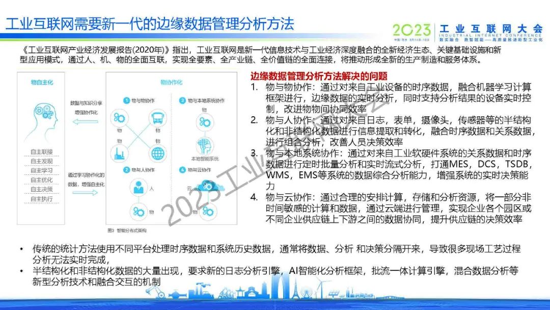 于辰濤指出,工業互聯網需要新一代的邊緣數據管理分析方法,半結構化和非結構化數據的大量出現,要求新的日志分析引擎,AI智能化分析框架,批流一體計算引擎,混合數據分析等新型分析技術和融合交互的機制。互聯網廠商、通信運營商、工業軟件與服務提供商和IT服務提供商將邊緣計算作為邊緣數據管理與分析的主要框架,融合大數據、物聯網、區塊鏈、人工智能等技術,共同推動了邊緣計算演進發展。