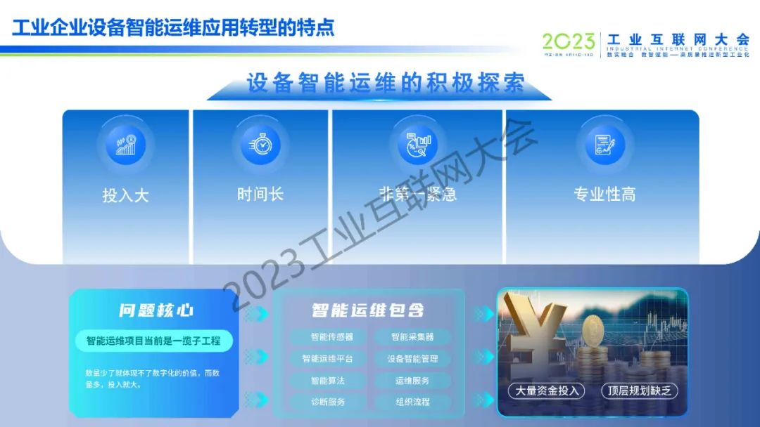 李星星介紹,建設智能工廠,智能生產、智能運維和智慧經營是三大板塊。工業企業設備智能運維應用轉型的特點是投入大、時間長、非第一緊急、專業性高。企業設備智能運維可以通過聚焦關鍵設備遠程運維、數字化覆蓋、業務智能化和業務模式變革來推進,達到降本增效的目的。
