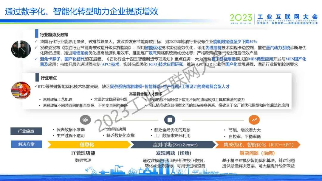王海指出,煉化數字化轉型工作已開展得如火如荼,提質增效、節能降碳也是各企業當前的必然需求。基于信息化、數字化、智能化、最優化的煉化企業數字化轉型、智能化發展模式,將迎來廣泛應用。融合機理和人工智能技術的智能管控優一體化平臺以MOM+RTO+APC為核心,聚焦生產效益,按需靈活配置,助力企業數字化、智能化轉型升級。