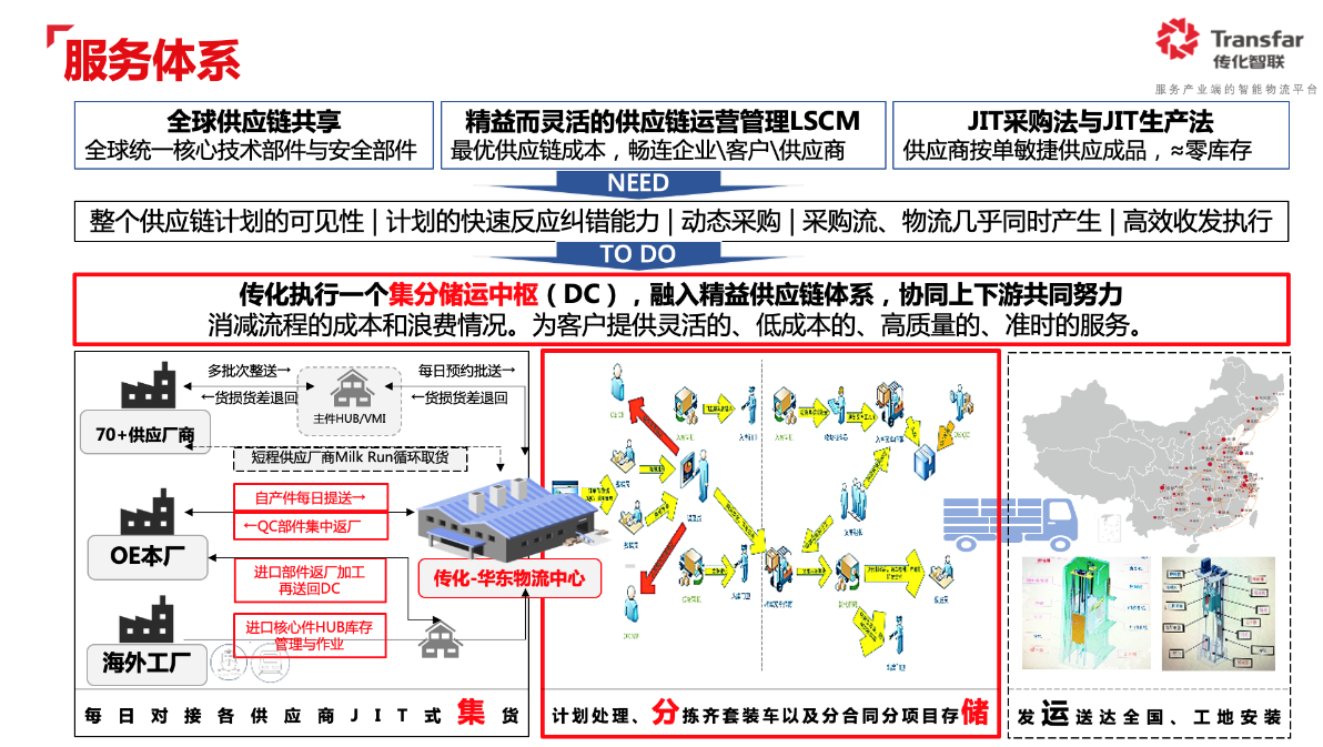 基地倉服務——定制化建設華東物流中心,提供年2.8萬臺整梯的集分儲運配服務:杭州傳化公路港1.58萬平場地+32人自營專業團隊+12臺叉車+行吊+生命線+智能系統+智能監控硬件;