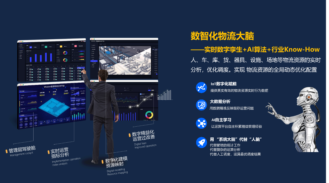 華清科盛研究開發的面向智能制造的供應鏈精益運營管理平臺Wisdom?,具備內部供應鏈所有場景的全域感知(包括位置感知、重量感知、數量感知、任務感知、對象感知、身份感知等一系列數據的采集和網絡傳輸技術)和全域資源效率分析優化功能,給各種供應鏈資源賦能(人員、貨架、叉車、揀選車、AGV、輸送線、物流容器等),智慧化統籌場域供應鏈資源配給,智能化的指揮調度現場包括人員、傳統設施和自動化設施等所有資源,代替現場人員完成思考、判斷、指引、防錯等一系列執行層事務,實現“不依賴人”并且可以“任意供應鏈崗位自由調度”的“萬能工”操作模式,并結合對自動化設施的調度實現“人機混合自動化”模式,以及多場域的供應鏈資源共享調度的模式,實現場域內供應鏈資源的低冗余投入,達到降本增效的目的。