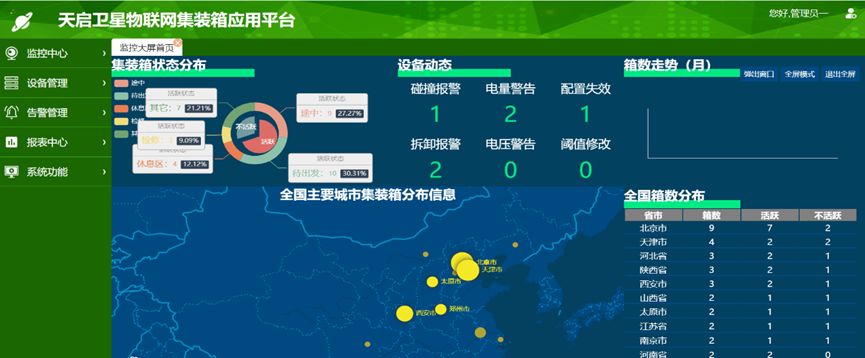 天啟衛星物聯網集裝箱運行管理平臺:該行業應用平臺為中集集團及客戶提供集裝箱狀態實時監控、歷史狀態查詢、集裝箱貨運合同管理等基本查詢和管理功能。天啟衛星終端設備接入我司(北京國電高科)M2M的公共開放平臺,可實現平臺所屬的全球范圍內任何天啟衛星終端,皆能通過天啟低軌衛星通信、地面運營商通信等多模通信鏈路,實現兼容多樣化通信數據格式,開放標準數據接口,方便用戶開發業務應用。該平臺是我司(北京國電高科)專門針對集裝箱垂直行業應用開發的結合邊緣計算、大數據、云計算等先進技術的物聯網應用管理平臺,平臺結合天啟衛星DCS物聯網數據通訊技術、GIS、傳感器數據采集,形成實時感知的無線傳感網絡,提供可追溯的實時溫濕度數據、報警服務等。