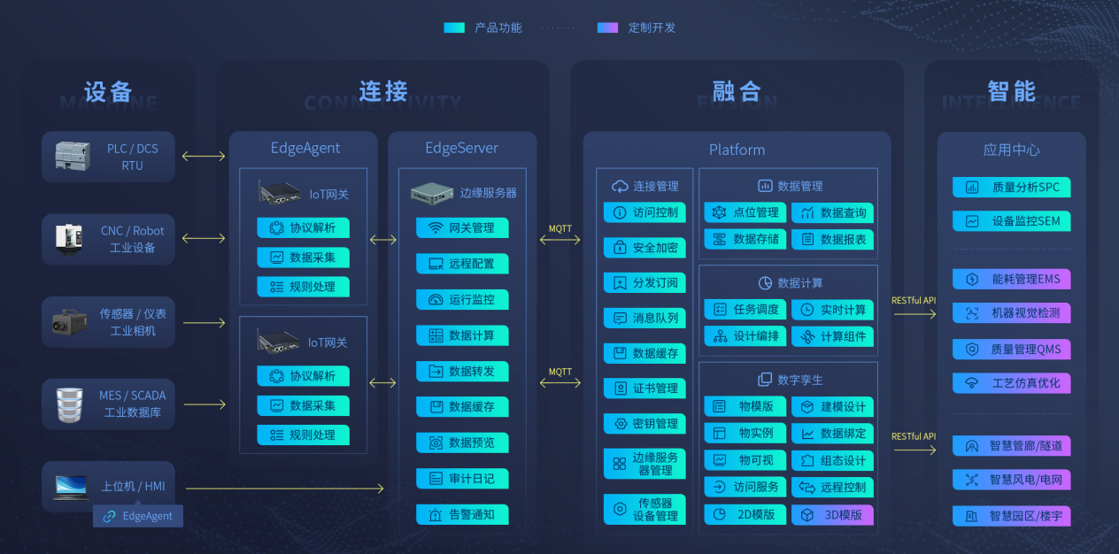 針對用戶的設備連接、系統協同、數據分析等需求,邊緣接入、數據采集、時序存儲、數據計算、數字孿生、數據可視化等能力、為企業(yè)提供從現場設備、傳感器、儀表接入到智能應用服務的端到端解決方案,構建智能監(jiān)測系統,實現工廠設備運行狀態(tài)、各位置耗能耗電情況、產品生產質量等實時遠程監(jiān)測。優(yōu)化、創(chuàng)新乃至重構企業(yè)戰(zhàn)略決策、產品研發(fā)、生產制造、經營管理、市場服務業(yè)務活動,構建數據驅動型高效運營管理模式。是各類制造企業(yè)數字化、智能化轉型、實現卓越運營的強大利器。