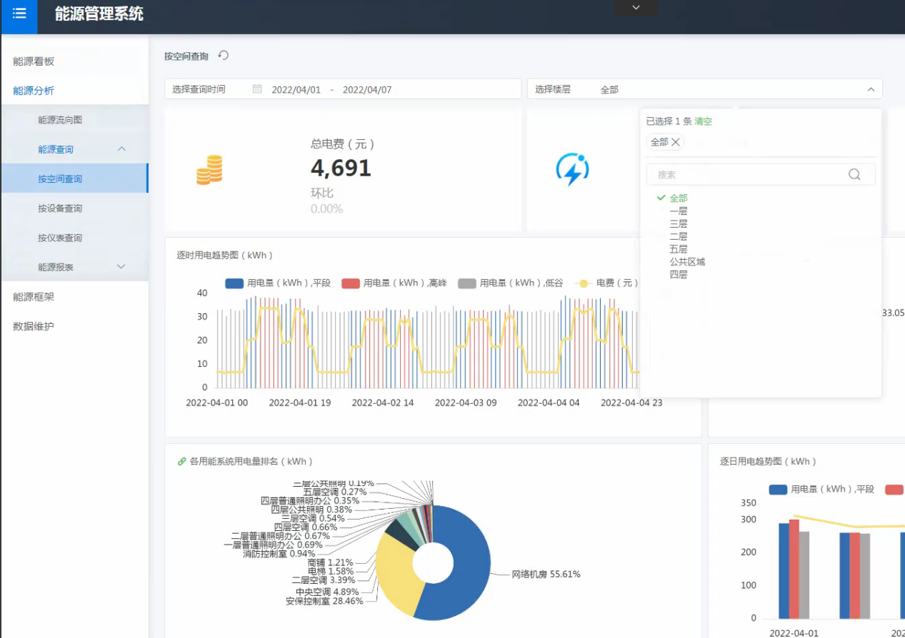 運(yùn)營分析能源管理。園區(qū)在能源管理方面具有很大的需求,能源管理能力的不足,會導(dǎo)致大量能源的浪費(fèi),園區(qū)應(yīng)對公共區(qū)域內(nèi)的用能進(jìn)行監(jiān)測,包括用水管理、用電管理、用氣管理。因此,本項(xiàng)目中通過建設(shè)全方位的能源管理系統(tǒng)對園區(qū)的能耗進(jìn)行實(shí)時(shí)采集以及能耗分析,基于人工智能在能耗分析方面的應(yīng)用,橫向?qū)Ρ韧愋蛨@區(qū)用能情況、縱向?qū)Ρ让咳铡⒃碌挠媚芮闆r,加強(qiáng)園區(qū)能耗精細(xì)化管理,發(fā)現(xiàn)園區(qū)潛在能耗大戶。