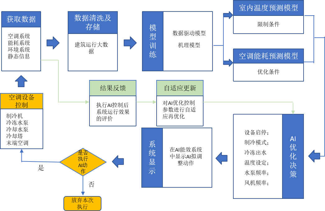 基于負(fù)荷預(yù)測進(jìn)行前饋優(yōu)化控制,自動調(diào)整空調(diào)主機(jī)冷凍水出水溫度設(shè)定值、冷凍水系統(tǒng)最佳流量設(shè)定、冷卻水最佳流量設(shè)定、空氣處理機(jī)組最佳出風(fēng)溫度設(shè)定、新風(fēng)量最優(yōu)控制、送風(fēng)量最優(yōu)控制等。通過機(jī)器學(xué)習(xí)模型,輸出最優(yōu)參數(shù)組合,達(dá)到節(jié)能減排效果。