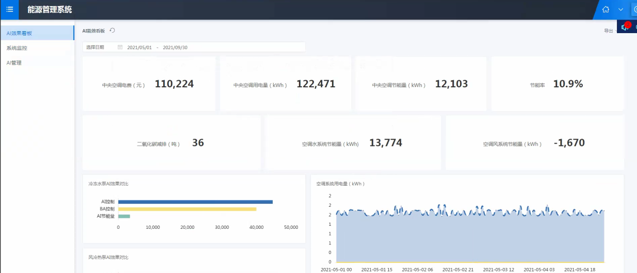 在穩(wěn)定運(yùn)行的基礎(chǔ)上,通過AI能效系統(tǒng)使設(shè)備高效運(yùn)行。根據(jù)實(shí)時(shí)采集的環(huán)境及設(shè)備數(shù)據(jù)對系統(tǒng)進(jìn)行實(shí)時(shí)調(diào)優(yōu),利用數(shù)學(xué)模型,優(yōu)化控制中央空調(diào)系統(tǒng)的運(yùn)行模式,提高系統(tǒng)運(yùn)行效率,延長設(shè)備壽命,降低系統(tǒng)維修成本。